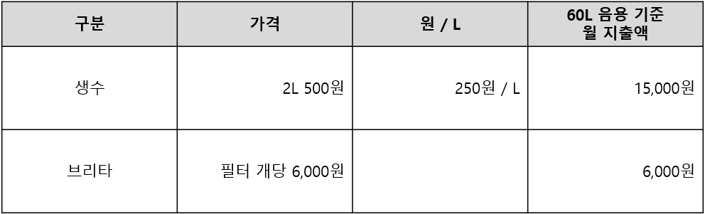 기타 설명은 모두 제쳐두고 당신이 관심 있어 할 한 달 실사용 기준 지출 금액부터 계산해보겠다. 필자는 렌탈 정수기는 사용해 본 적이 없고 그 종류도 너무 다양하니 생수와 브리타 정수기 사용 시만 기준으로 계산해보겠다. 이 때, 하루 물 권장 섭취량은 컵으로 8잔, 약 1.6L에 해당되지만 계산의 편의를 위해 하루 2L, 한 달 30일 기준 60L를 섭취한다고 가정하겠다.